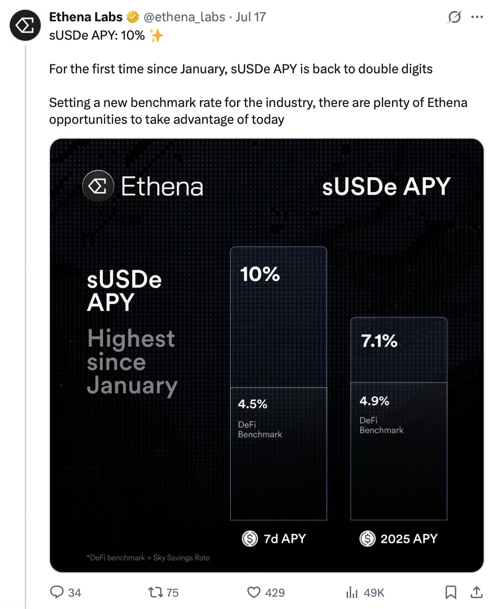 sUSDe has been one of the hottest products in DeFi this year. In fact, for the first time since January, its APY is back above 10%. That’s a compelling yield right now, especially considering: