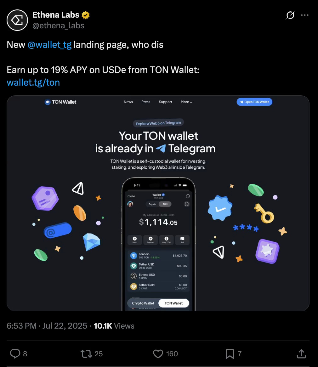 Ethena has launched a dedicated use case for sUSDe inside Telegram, letting users send, save, and spend in a mobile neobank-like experience.