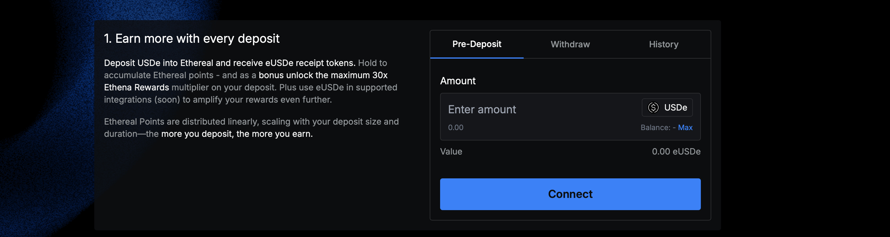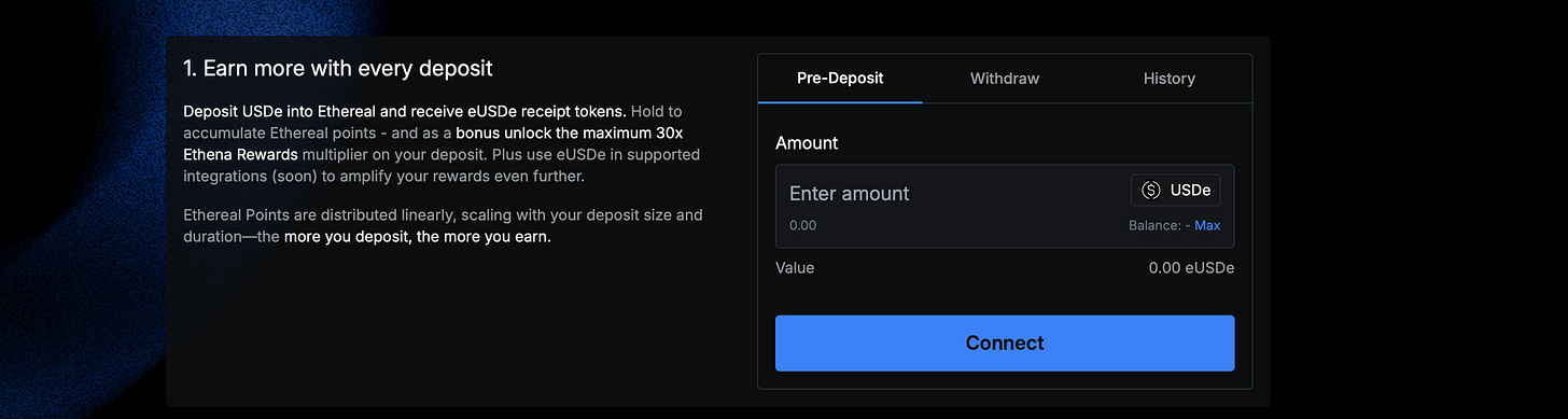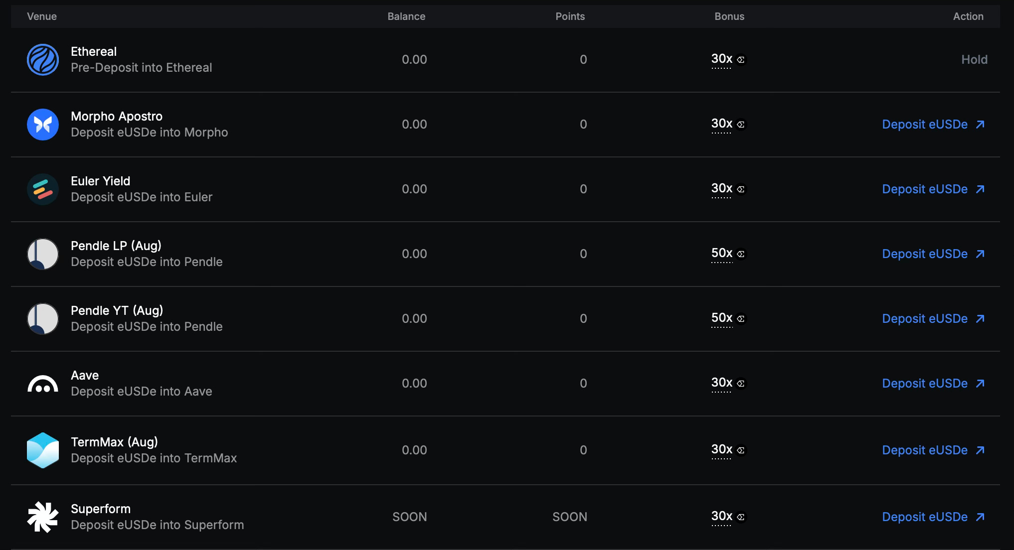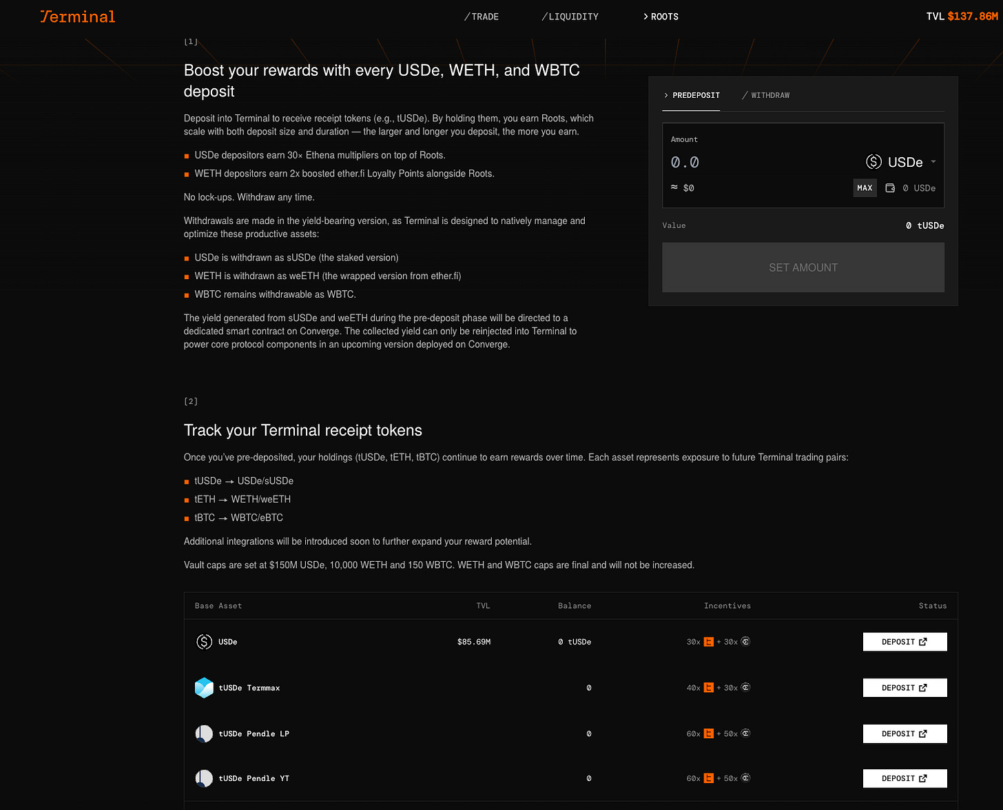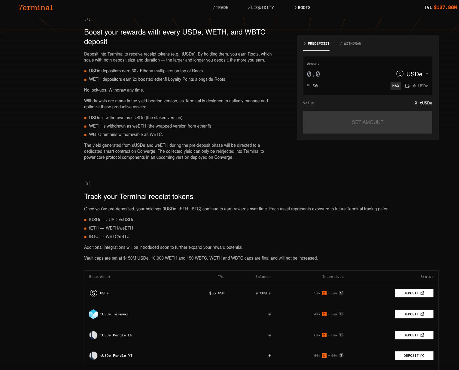 You can pre-deposit USDe, wETH and wBTC to earn points before Terminal launches, you will of course also earn Ethena Sats, which will qualify you for the next airdrop.
