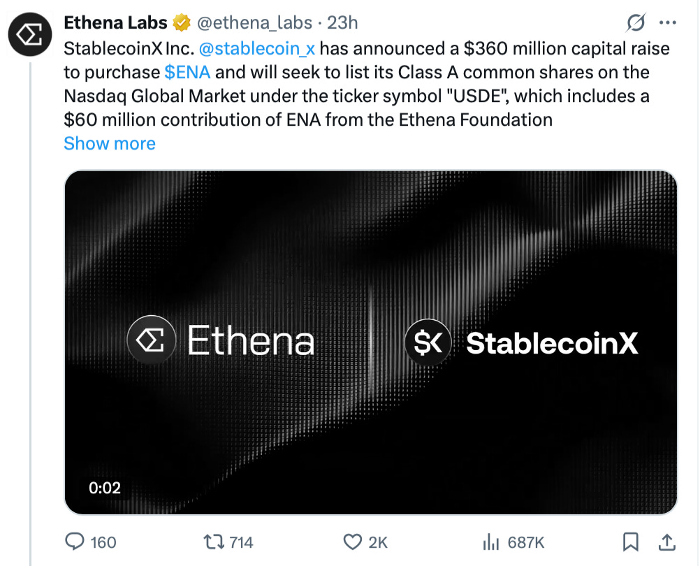 As I have said, Ethena already has its token, ENA. The latter has been on the rise lately, following the announcement of StablecoinX’s $360 million capital raise to purchase ENA. This planned buy represents roughly 8% of the circulating supply and is set to be accumulated over the next six weeks.