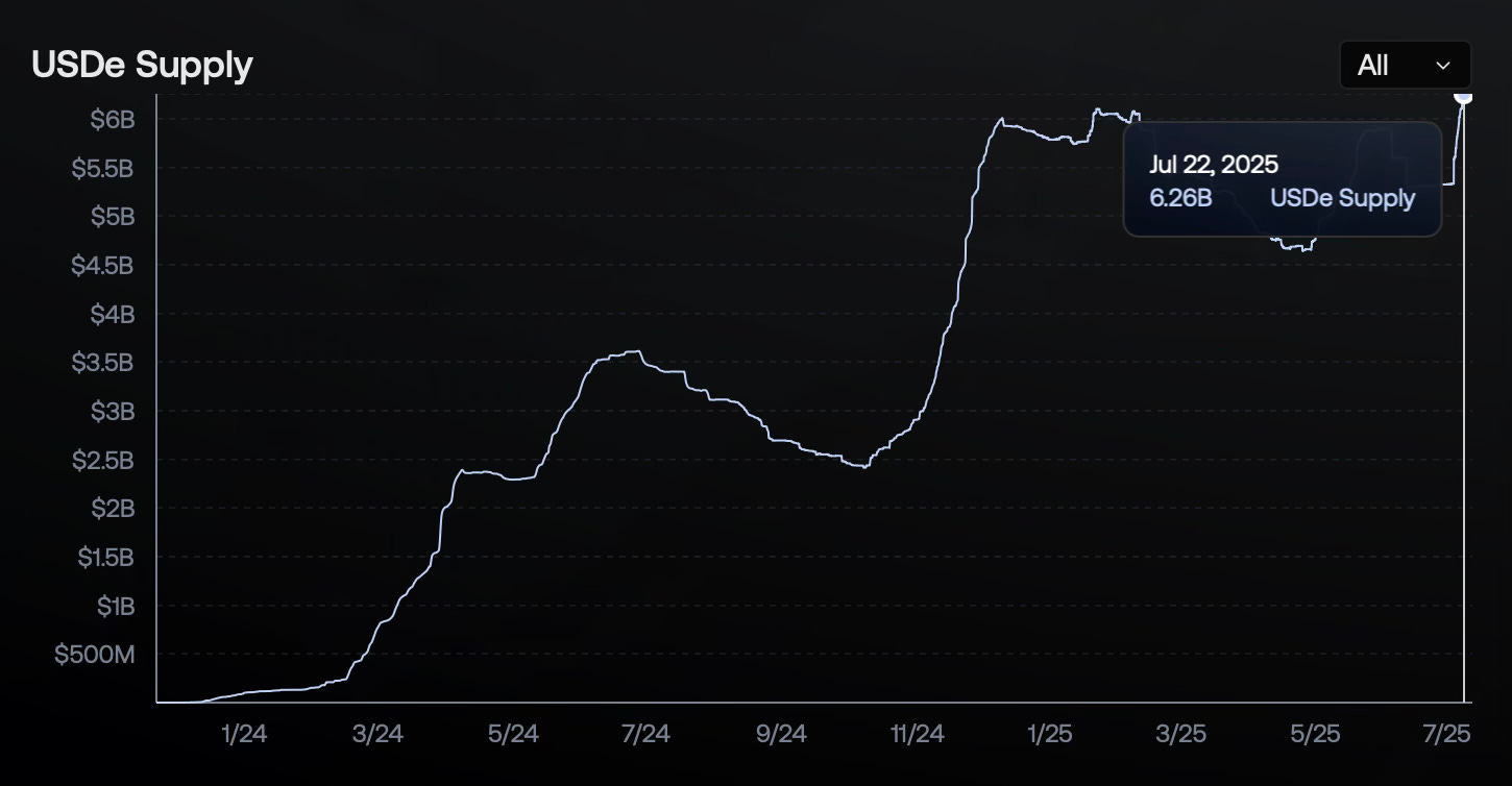 No surprise, then, that Ethena has been growing fast. The supply of USDe is at an all-time high above $6B.