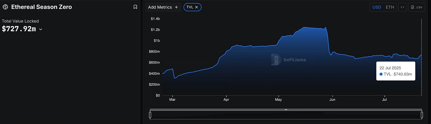 Ethereal already has over $740M in TVL (down from $1.25B), which is huge for a project that hasn’t launched yet.
