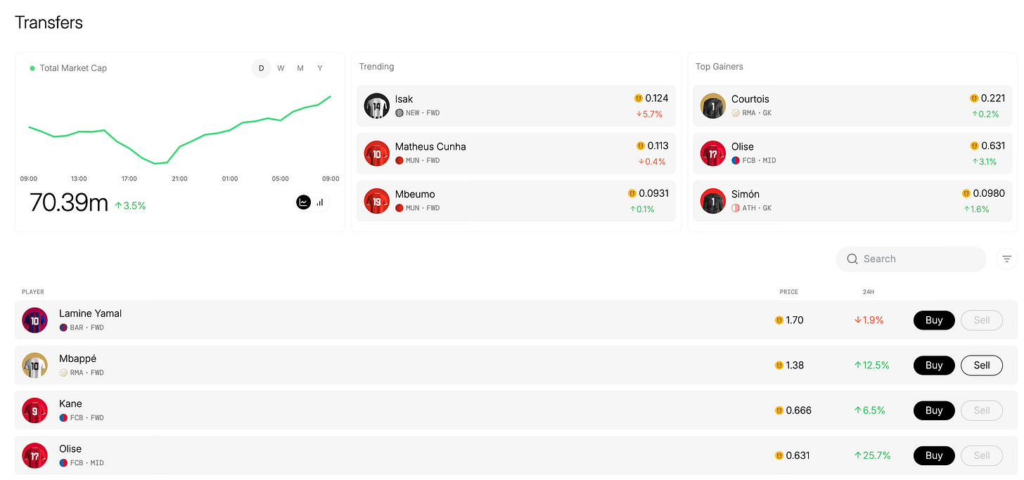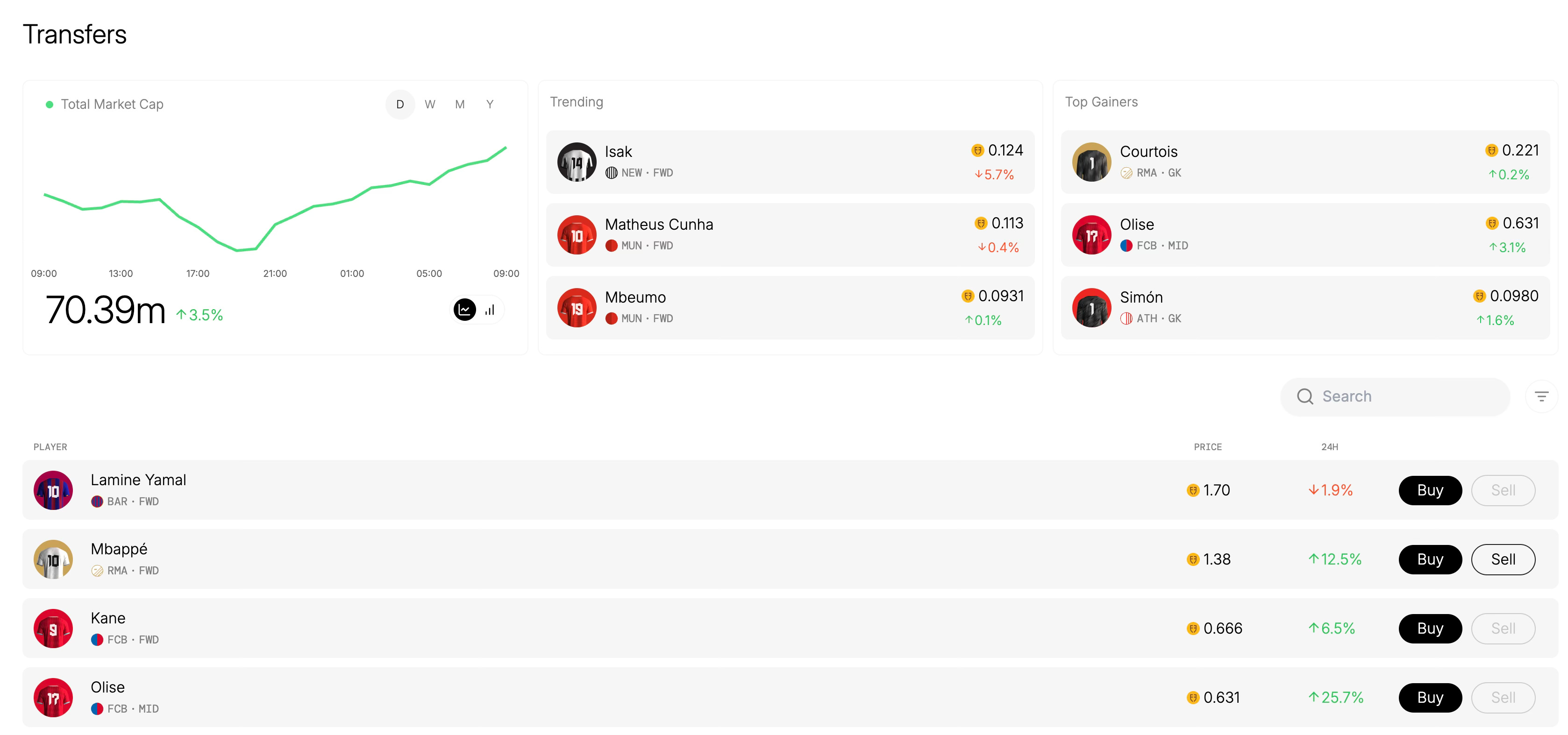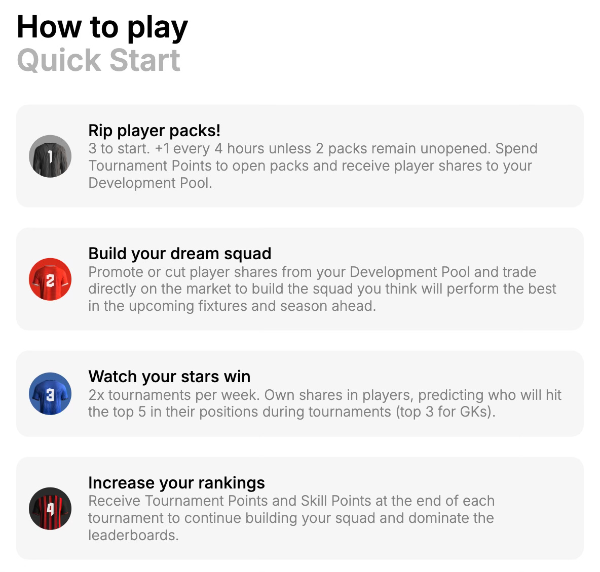 Once you’ve bought shares, players are automatically entered into weekly tournaments. Depending on performance on the pitch, you earn: TP (Tournament Points), SP (Skill Points), a % share of the prize pool.