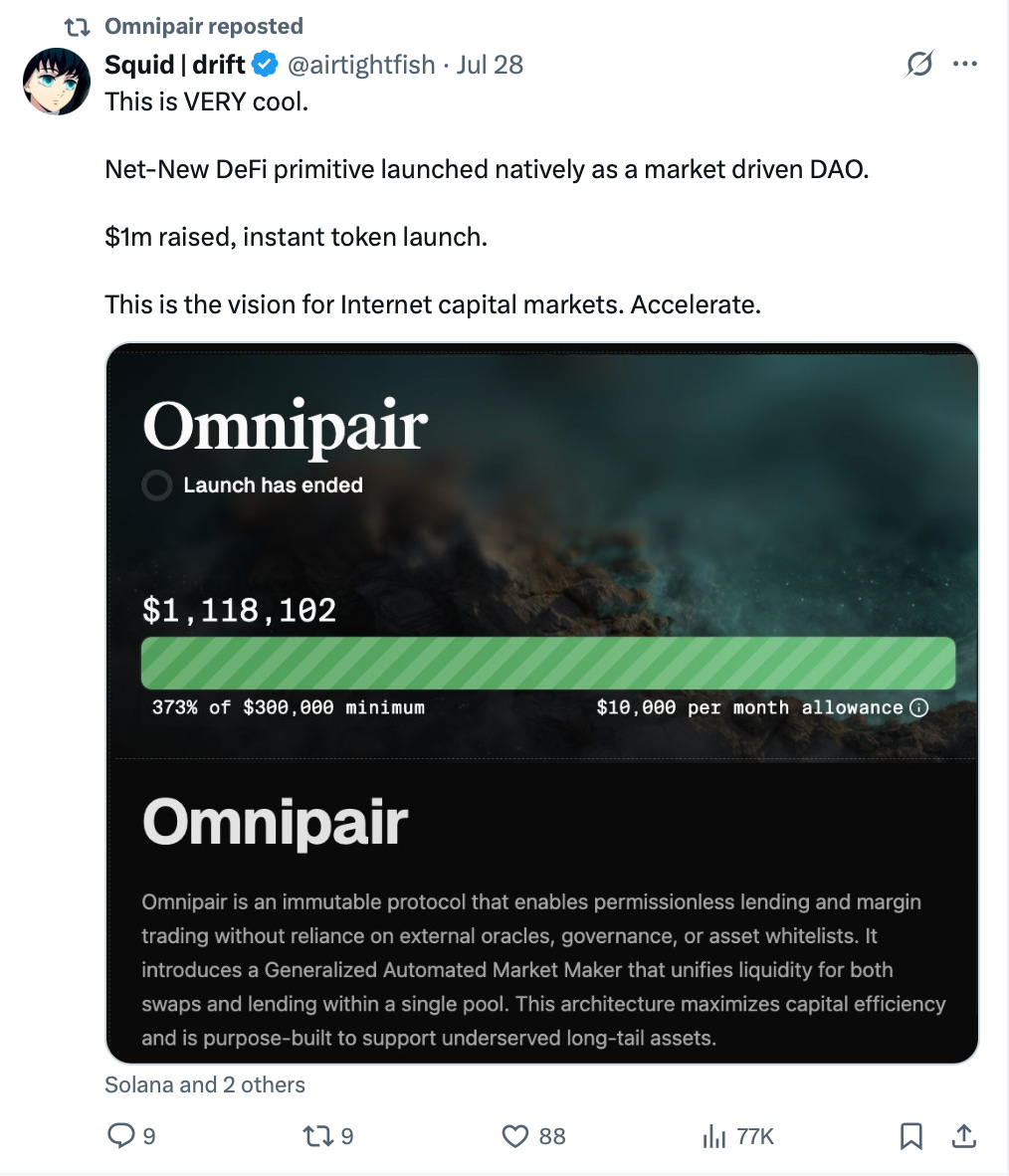 Omnipair is an early-stage project that launched its ICO on the MetaDAO platform. It is the very first DeFi protocol to embrace Futarchy from day one. Highly experimental, but very promising project, and great to see some DeFi innovation on Solana.