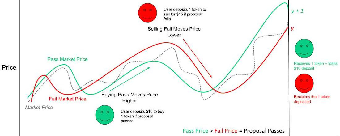 Instead of debating proposals in endless forums and then voting, Futarchy leverages the power of markets to forecast which decisions will be best. Proposals pass when the market speculates that they're good. Proposals fail when the market speculates that they're bad.