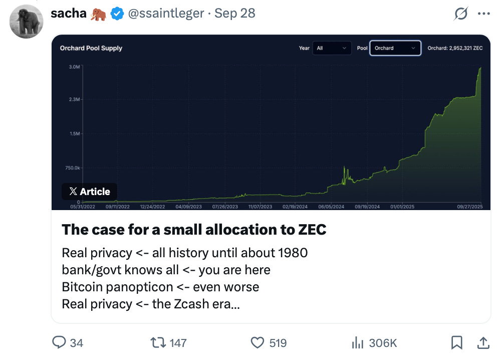 ZCash is an OG protocol from 2016 that built on this exact idea: create a private store-of-value solution. It’s a PoW blockchain with ZEC as its native asset, inheriting the same supply cap (21M) and inflation schedule as Bitcoin, but with a privacy options embedded at the protocol level through zero-knowledge encryption.