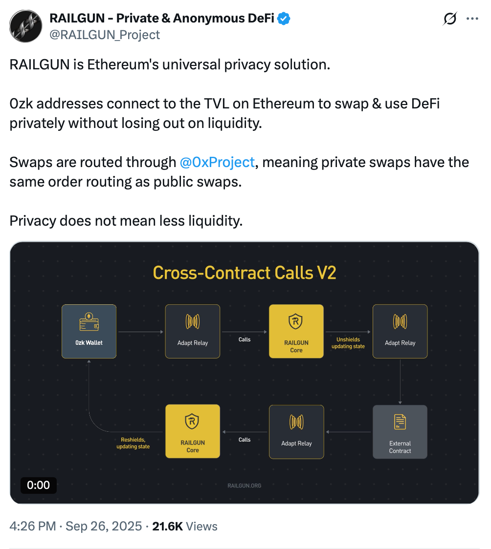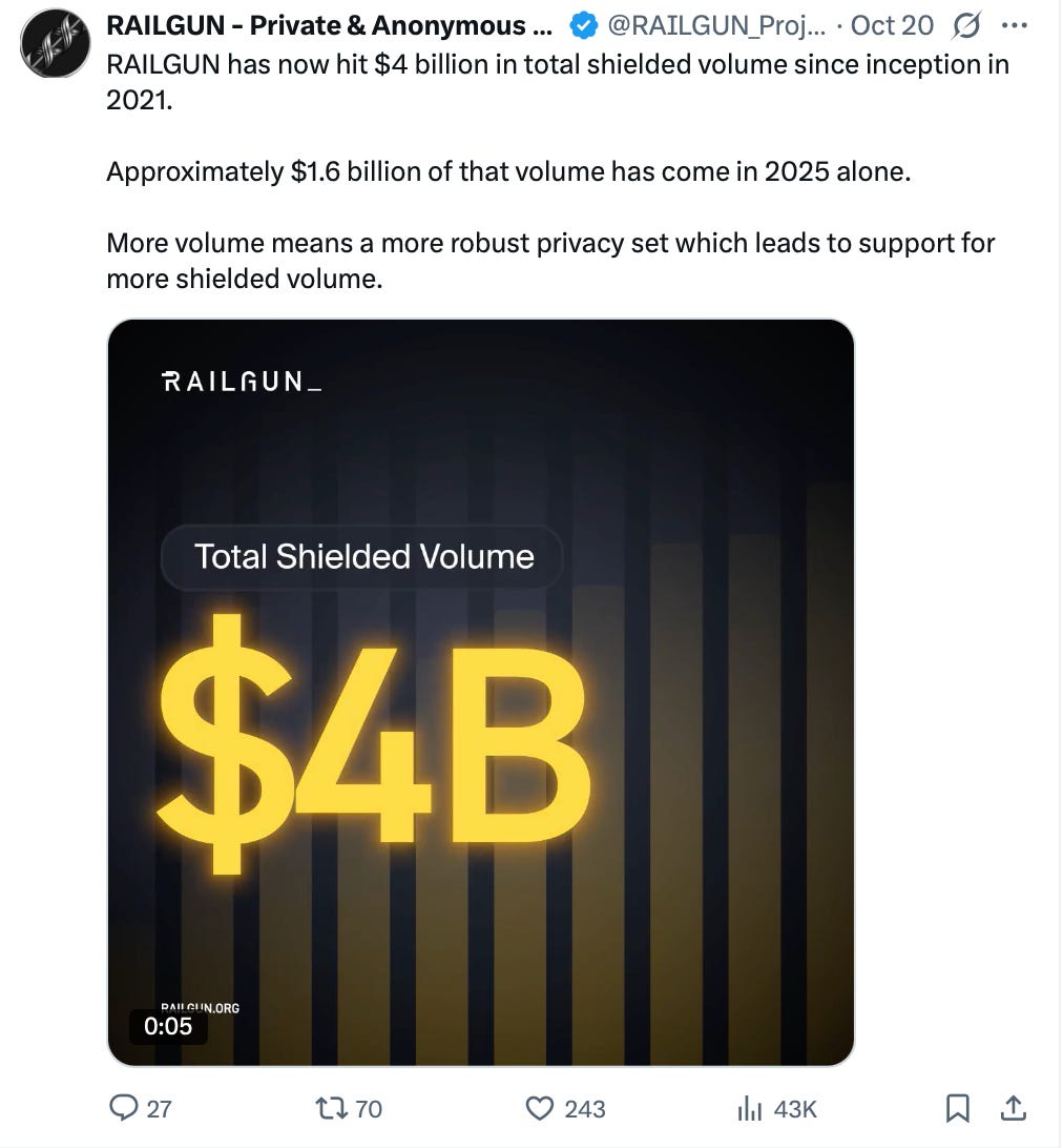 The protocol has gained significant traction since launch, with over $4B in total shielded volume to date. This clearly shows there’s a real market need for privacy infrastructure like Railgun. Moreover, Vitalik himself has been a strong advocate of the protocol, which is both reassuring and a strong signal that some of the brightest minds in the space deeply care about the topic of privacy.