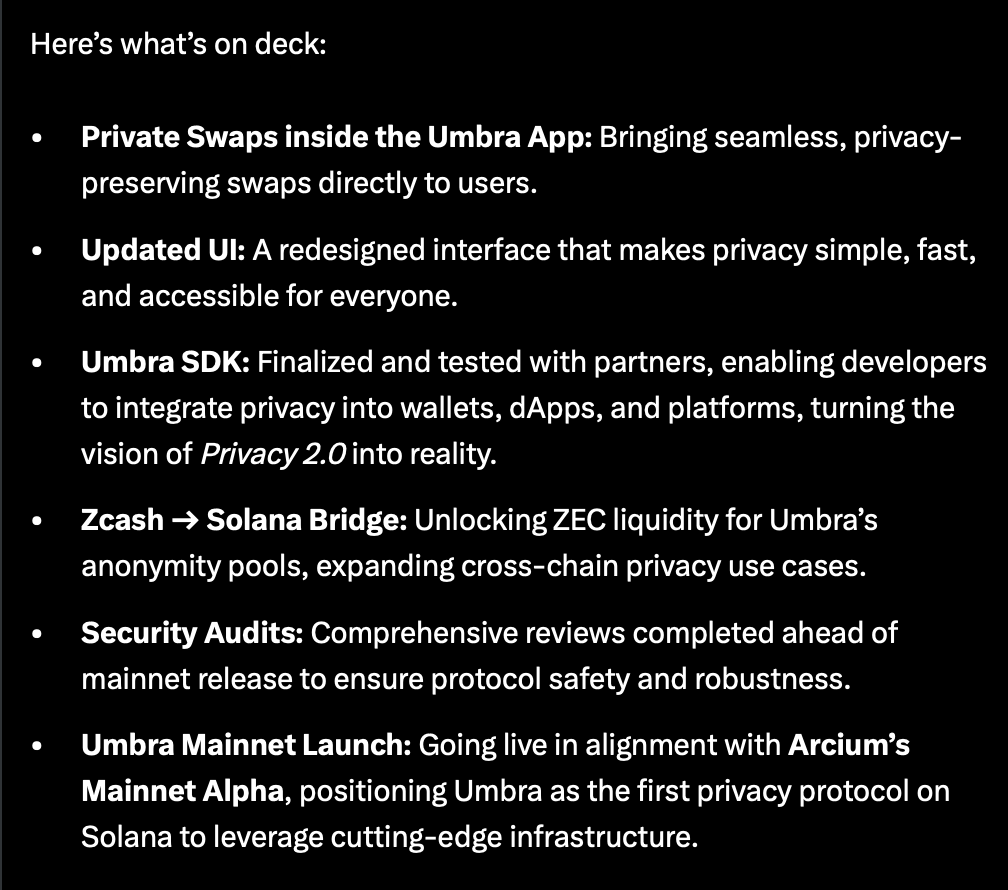 Umbra’s goal is to serve as the privacy layer for Solana by providing the necessary infrastructure to execute confidential transactions, allowing users and applications to protect their data on-chain.