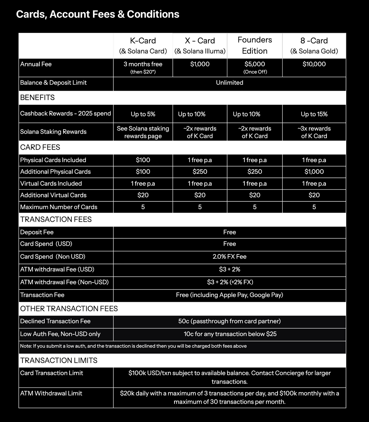 Onboarding is easy, UX is seamless, and the KYC process is straightforward. They offer different card options, both virtual and physical. Prices range from $20 per month for the basic card to a one-time fee of over $5,000 for the card with the highest benefits. They also have a special Solana Card collection as well.