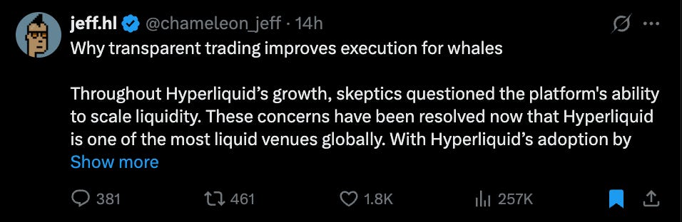 Hyperliquid founder argues whales often get better execution by trading transparently because when the market sees your flow, liquidity providers can compete to fill it more efficiently.
