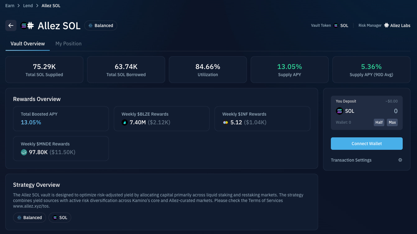 The Allez SOL vault is sitting at 13.05% APY currently and offering rewards across many tokens. A pretty decent yield for lending out your SOL, and without having to manage leverage etc.