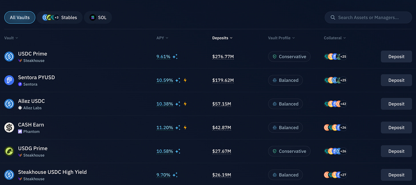 The Lend tab on Kamino is full of opportunities around ~10% APY with very clear explanations of the yield strategies which are rooted in Kamino’s lending protocol.