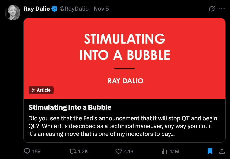 Articles by Ray Dalio are always worth a read. His latest piece argues that we’ve reached a key turning point in the Big Debt Cycle, signaling that the U.S. may be entering a late-stage debt and asset bubble phase.