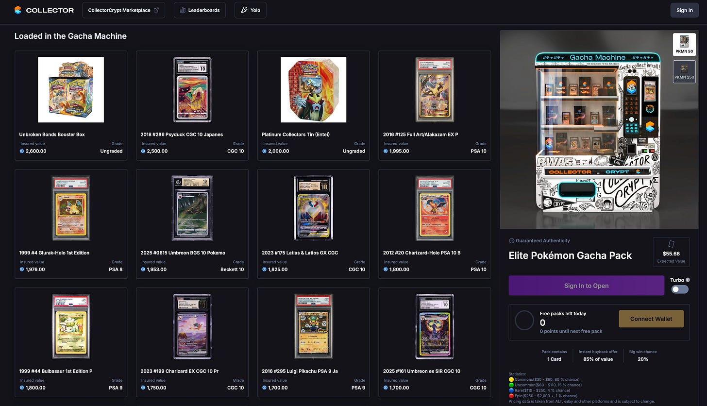 You can open packs of different price points to get a single graded card or a physical graded comic. You will always get a buyback offer. The odds of pulling collectables of different price points are transparently displayed. You always have like a 1% chance of landing something huge.