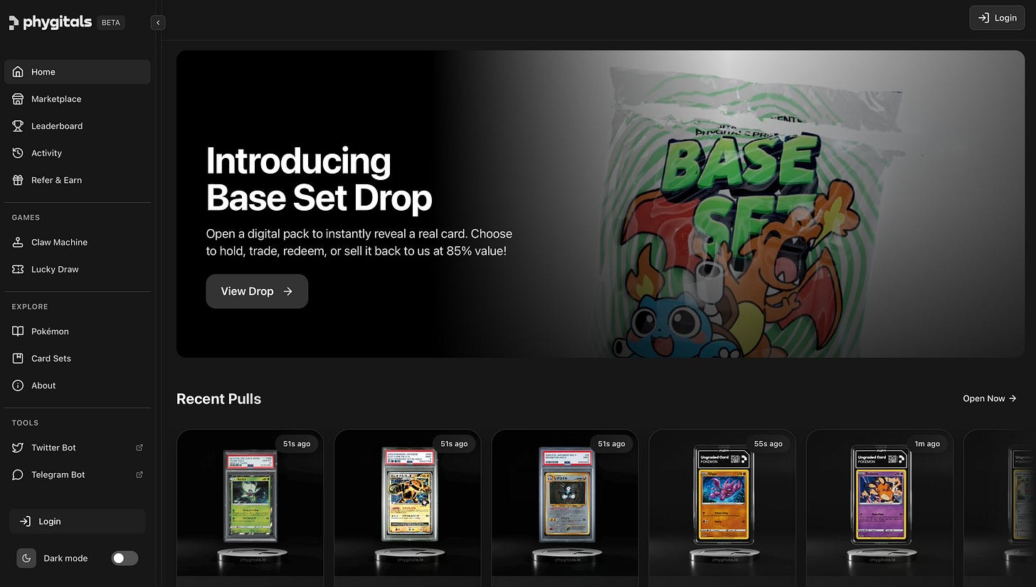 On top of its marketplace, Phygitals also offers two ways to collect trading cards: Claw Machines (pay to open a pack, similar to Courtyard) and Lucky Draw (a lottery-style system for cards).