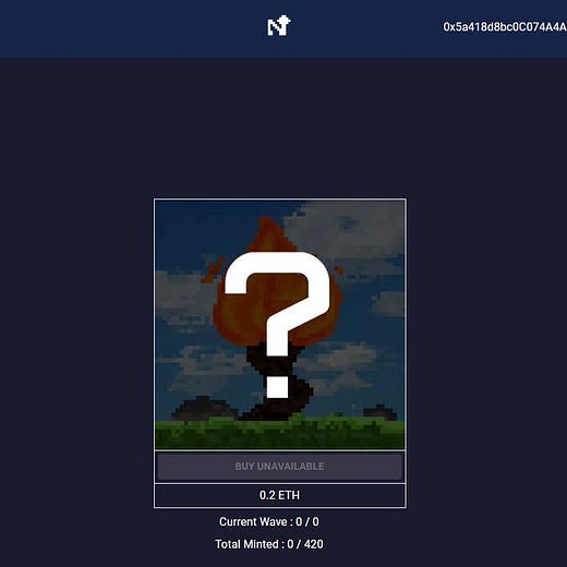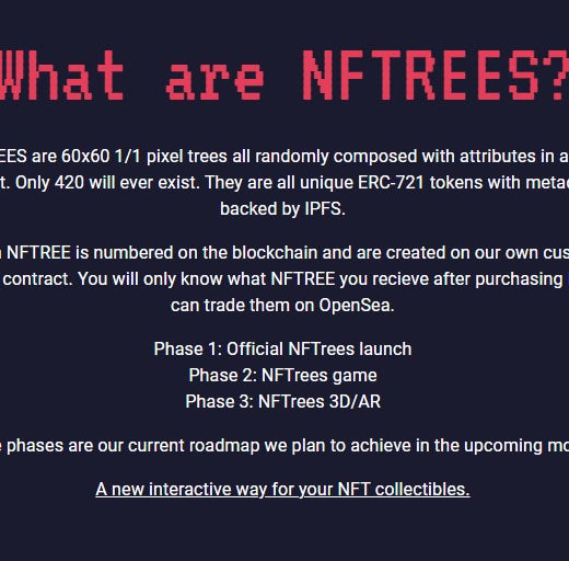 NFTrees was an avatar collectible project with a max supply of 420(!) and it’s made up of randomly composed pixel trees.